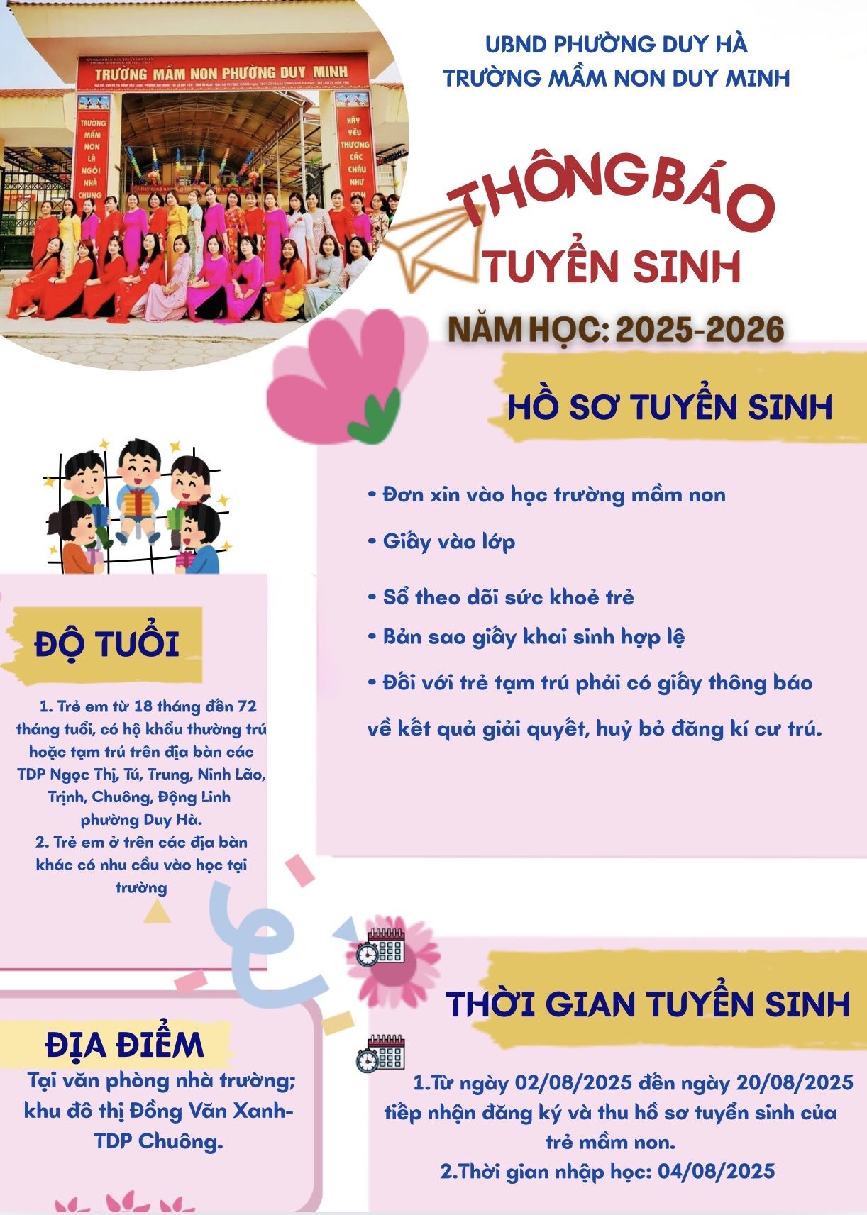 Trường MN Duy Minh, phường Duy Hà, tỉnh Ninh Bình xin trân trọng thông báo các cha mẹ có con trong độ tuổi MN đến văn phòng nhà trường tại khu Đồng Văn Xanh – điểm trung tâm để đăng ký và làm hồ sơ tuyển sinh cho con vào trường học. Ngày bắt đầu học mồng 4/8/2025. Trân trọng!