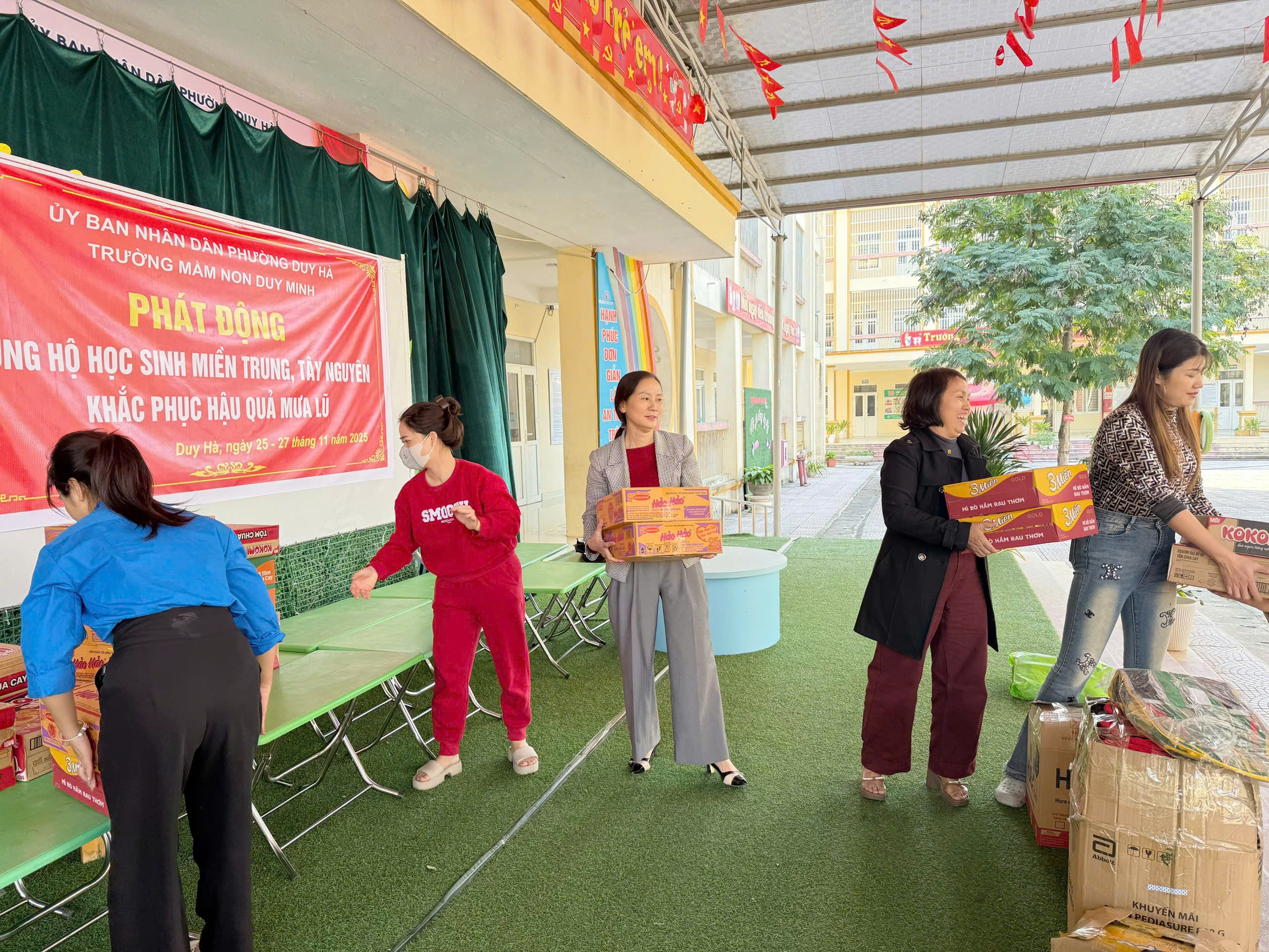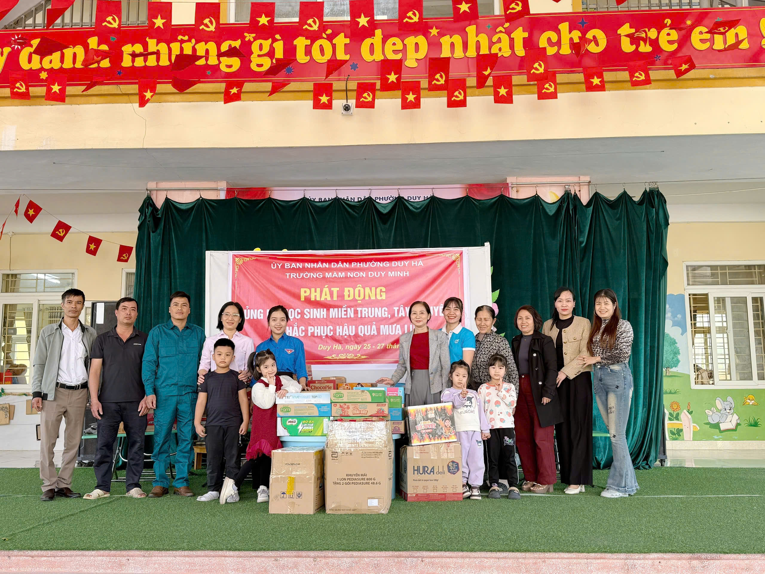 Hưởng ứng lời kêu gọi của Ủy ban Mặt trận tổ quốc phường Duy Hà, sau 1,5 ngày phát động sự ủng hộ của toàn thể cán bộ, giáo viên, nhân viên và các bậc cha mẹ trẻ. Trường mầm non Duy Minh đã nhận được sự hưởng ứng nhiệt tình, sự sẻ chia với học sinh các tỉnh miền Trung, Tây Nguyên bị ảnh hưởng mưa lũ với tổng số tiền là 31.690.000 đồng và nhiều sách vở, đồ dùng học tập và nhu yếu phẩm.