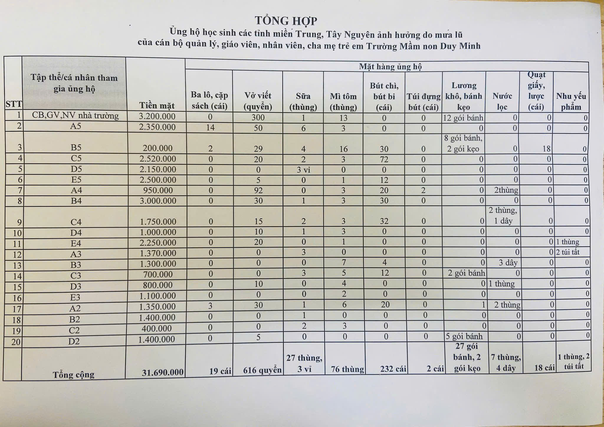 Trường mầm non Duy Minh xin trân trọng cảm ơn những tấm lòng vàng và nghĩa cử cao đẹp của tập thể cán bộ, giáo viên nhân viên và các bậc cha mẹ trẻ đã “CHUNG TAY VÌ MIỀN TRUNG – TÂY NGUYÊN THÂN YÊU”.